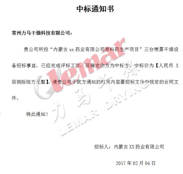 經(jīng)過廣泛的調(diào)研和嚴(yán)格的測驗(yàn),內(nèi)蒙古xx藥業(yè)有限公司,^終決定向常州力馬科技有限公司定購三臺原料藥噴霧干燥機(jī),單筆金額高達(dá)百萬余元,貢獻(xiàn)力馬新春第一單,為力馬贏得了農(nóng)歷雞年的頭彩。同時也展示了內(nèi)蒙古xx藥業(yè)有限公司蓬勃的生機(jī)和迅猛的發(fā)展勢頭,真誠祝愿兩家公司合作愉快、雞年大吉。
